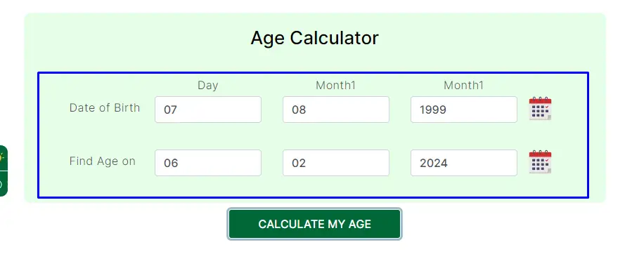 - After you have entered these figures, the calculator will add up everything itself. It takes away your birth number from the current date (or the date you filled in) to calculate your age.