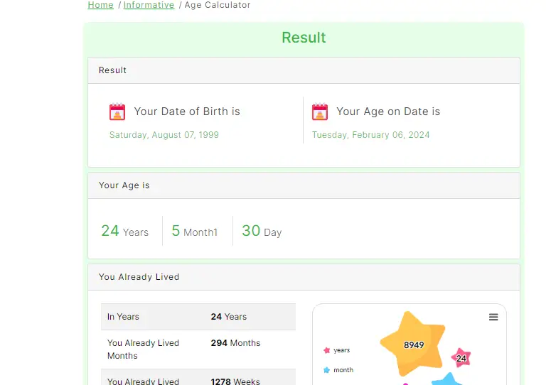 However, it may be a simple calculation, but leap years and the time when you were born are not taken into account. Suppose you are interested in a more detailed calculation. You could use an age calculator. This estimate, from a practical point of view, should result in an approximate age.